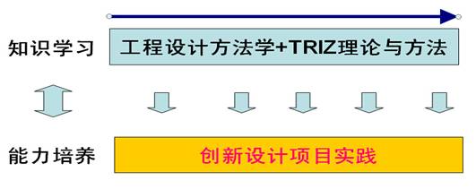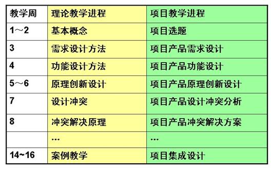 我们具体来看一下我的这门课。我的这门课程叫《工程创新设计方法学》,课分成两块:一块是设计方法学,还有一块是TRIZ理论与方法(如图2所示)。那么具体的教学安排,我把16周的教学内容大致安排如下(如图3所示),左边是理论教学的过程,右边是项目教学的进程,这样我基本上做到了理论教学和项目进程的同步。